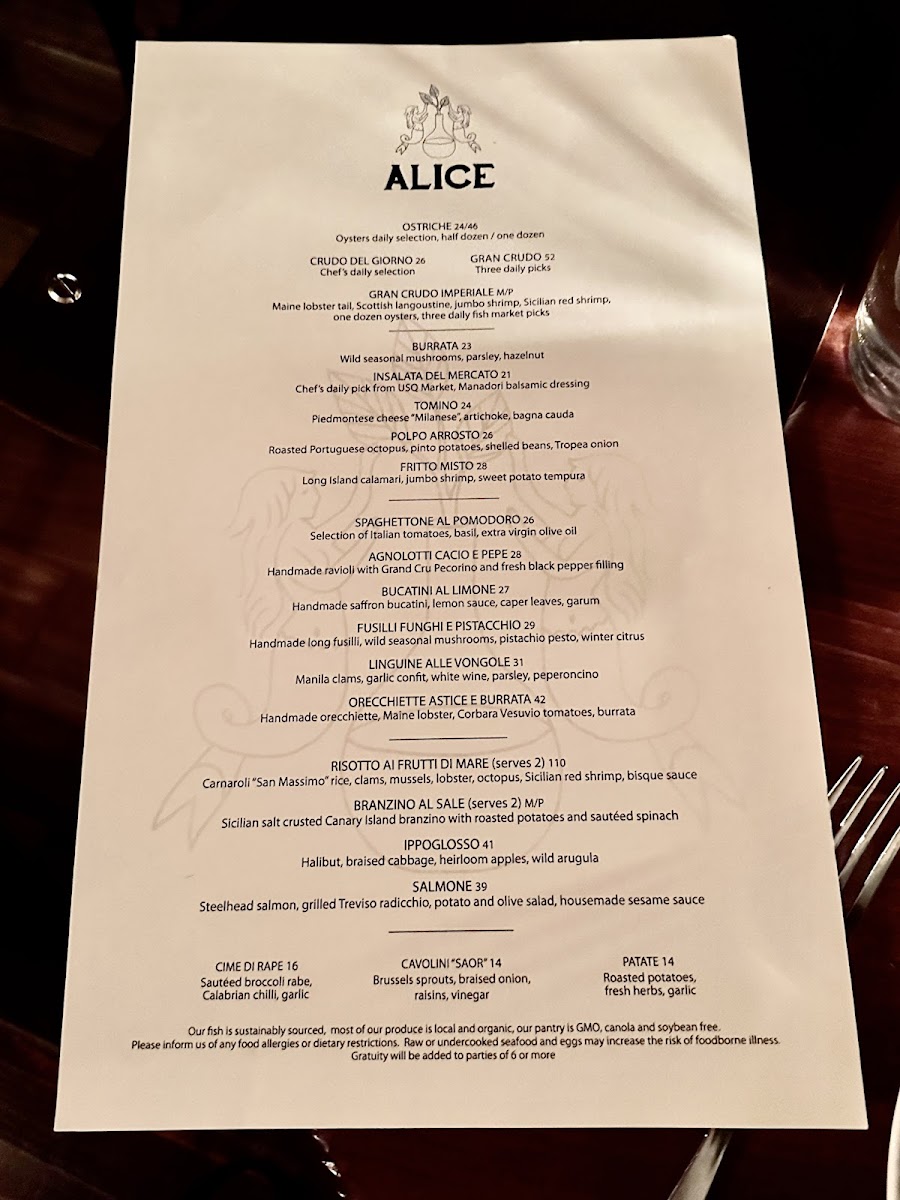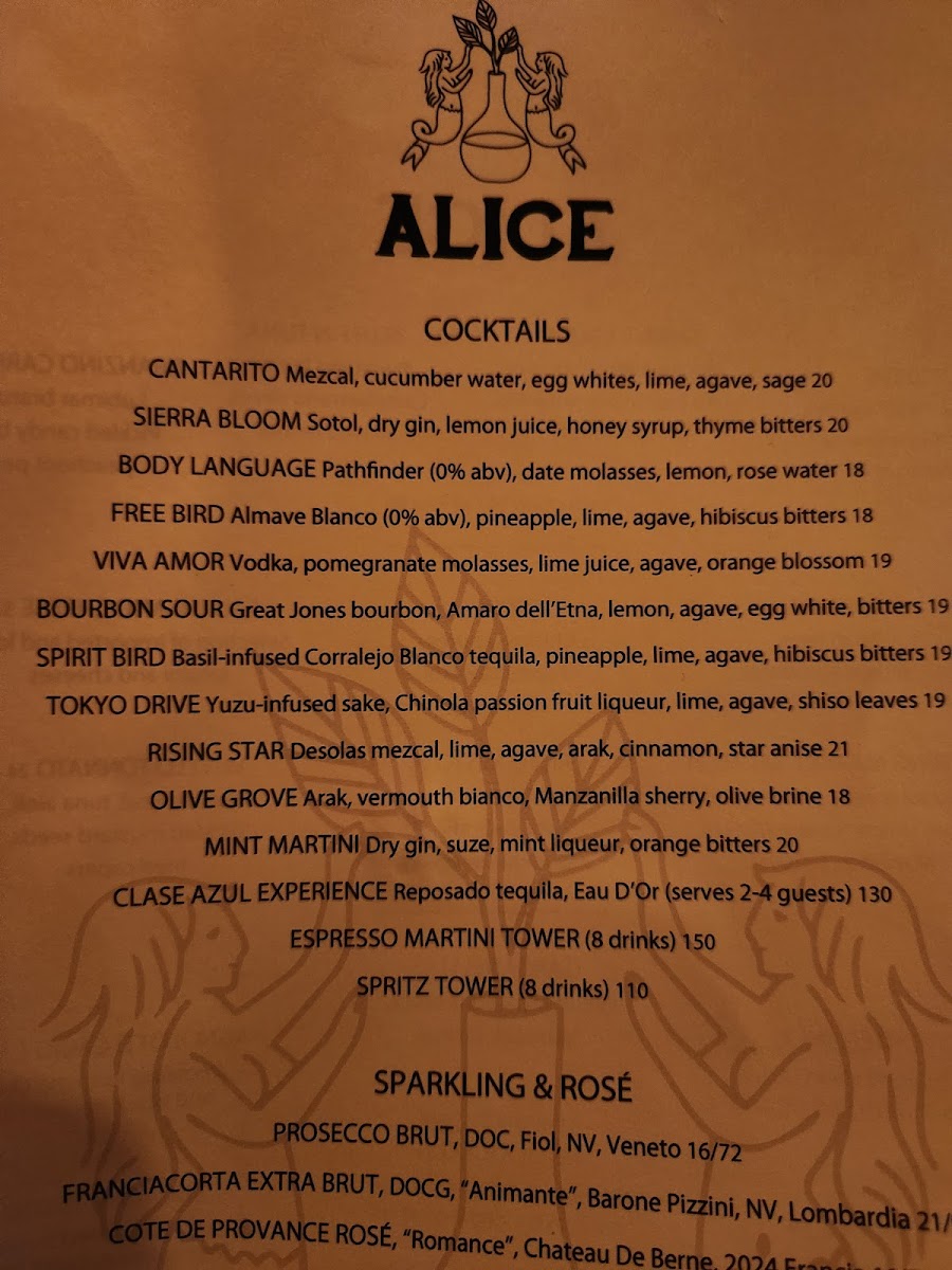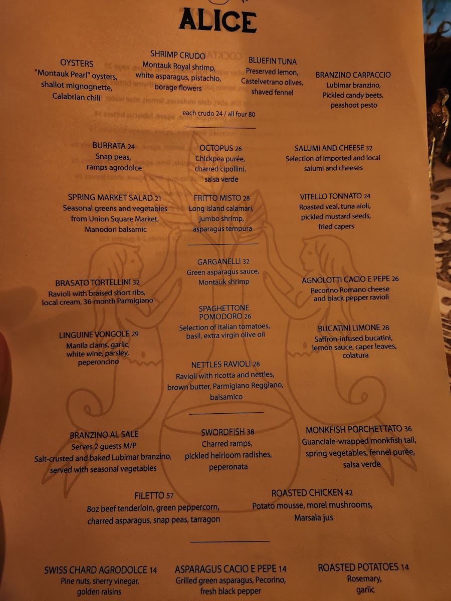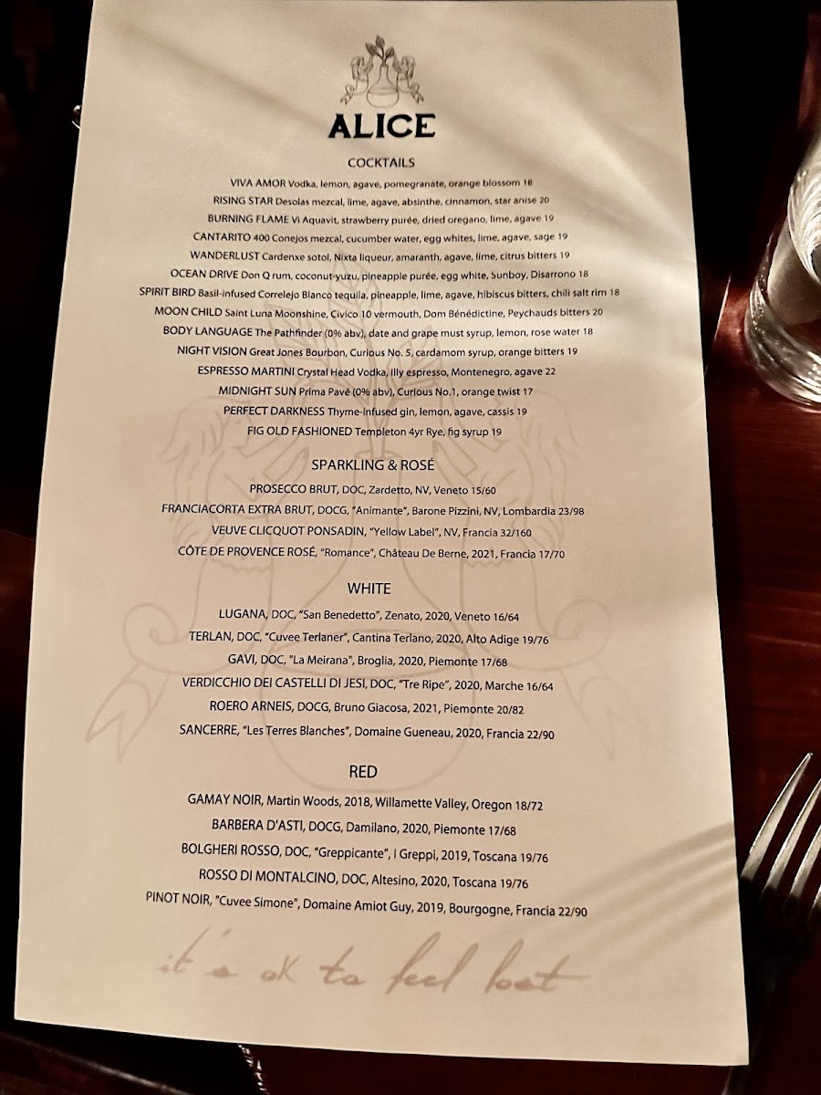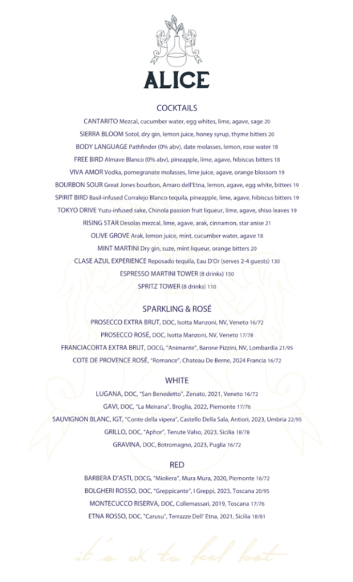 Step into Alice, where every bite tells a story. Nestled in the heart of New York at 126 W 13th St, this menu invites you on a flavorful journey that blends creativity with comfort. The dishes at Alice reflect a true dedication to fresh, high-quality ingredients, offering a mix of both modern twists on classics and unique creations that spark curiosity. Whether you're craving something light and fresh or indulgent and hearty, the vibrant flavors here are sure to satisfy your appetite. Explore a variety of options, each designed to bring something special to the table, making it the perfect spot for any occasion. From the moment you dive into the Alice Menu, you'll know you're in for something memorable.
